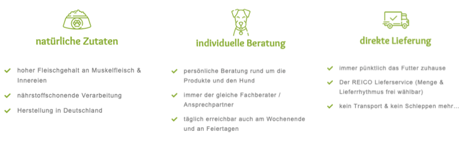Das Reico Hundefutter kommt direkt aus der Natur in den Napf. Ohne künstliche Zusatzstoffe, Geschmacksverstärker, Getreide oder Zucker. Dafür mit 100% naturbelassenen Rohstoffen, sorgfältig gewählten Kräutern und hohem Anteil an wertvollem Frischfleisch.